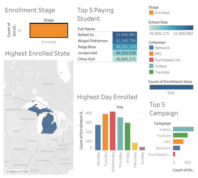 - Utilized Excel and Tableau to identify the day and month with the highest number of enrollments, aiding in strategic planning.